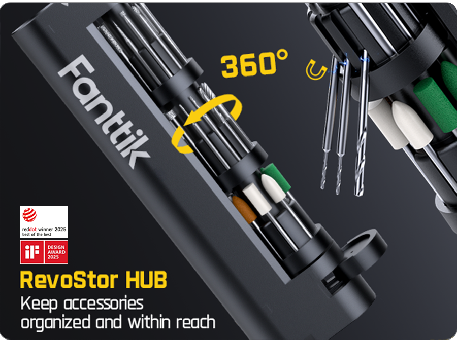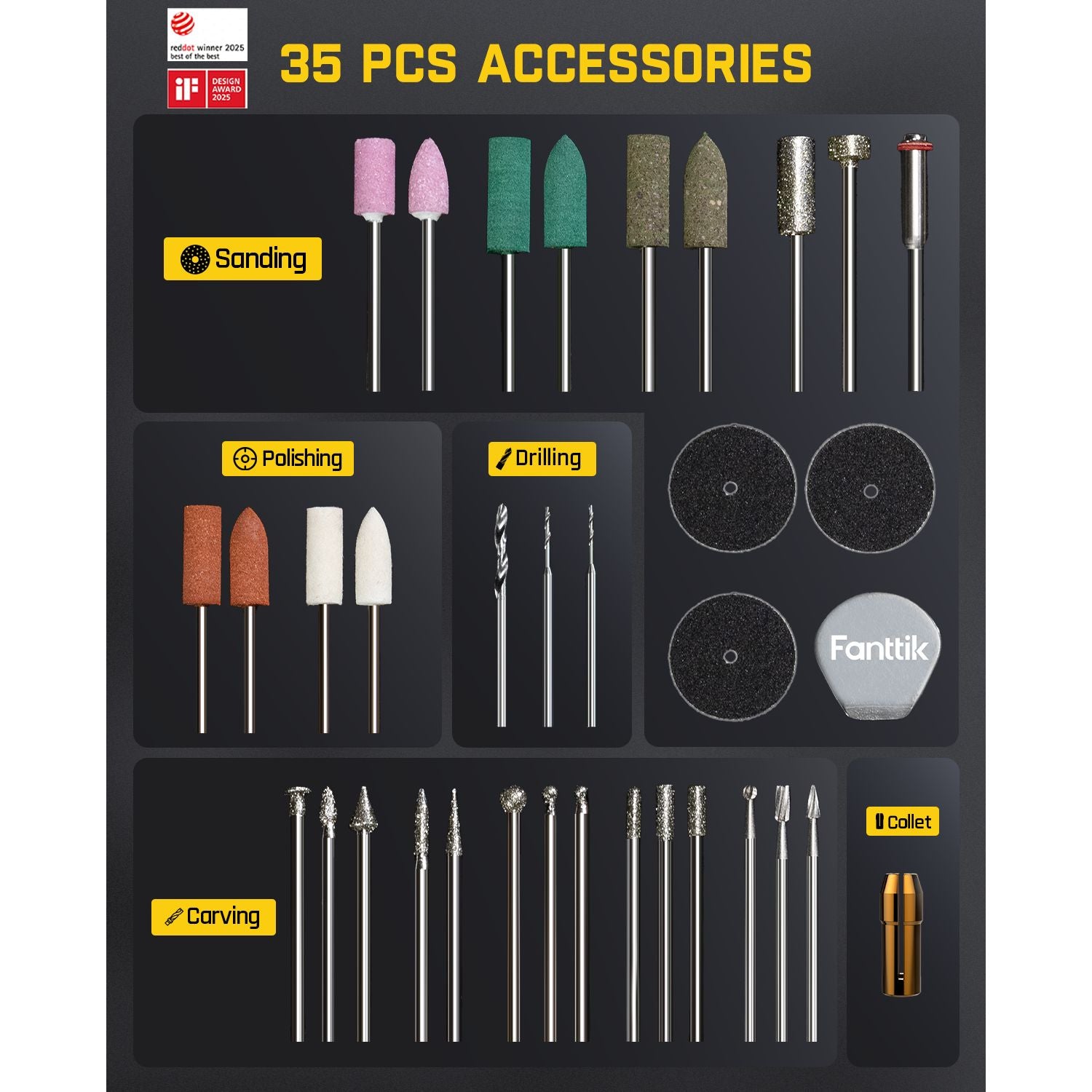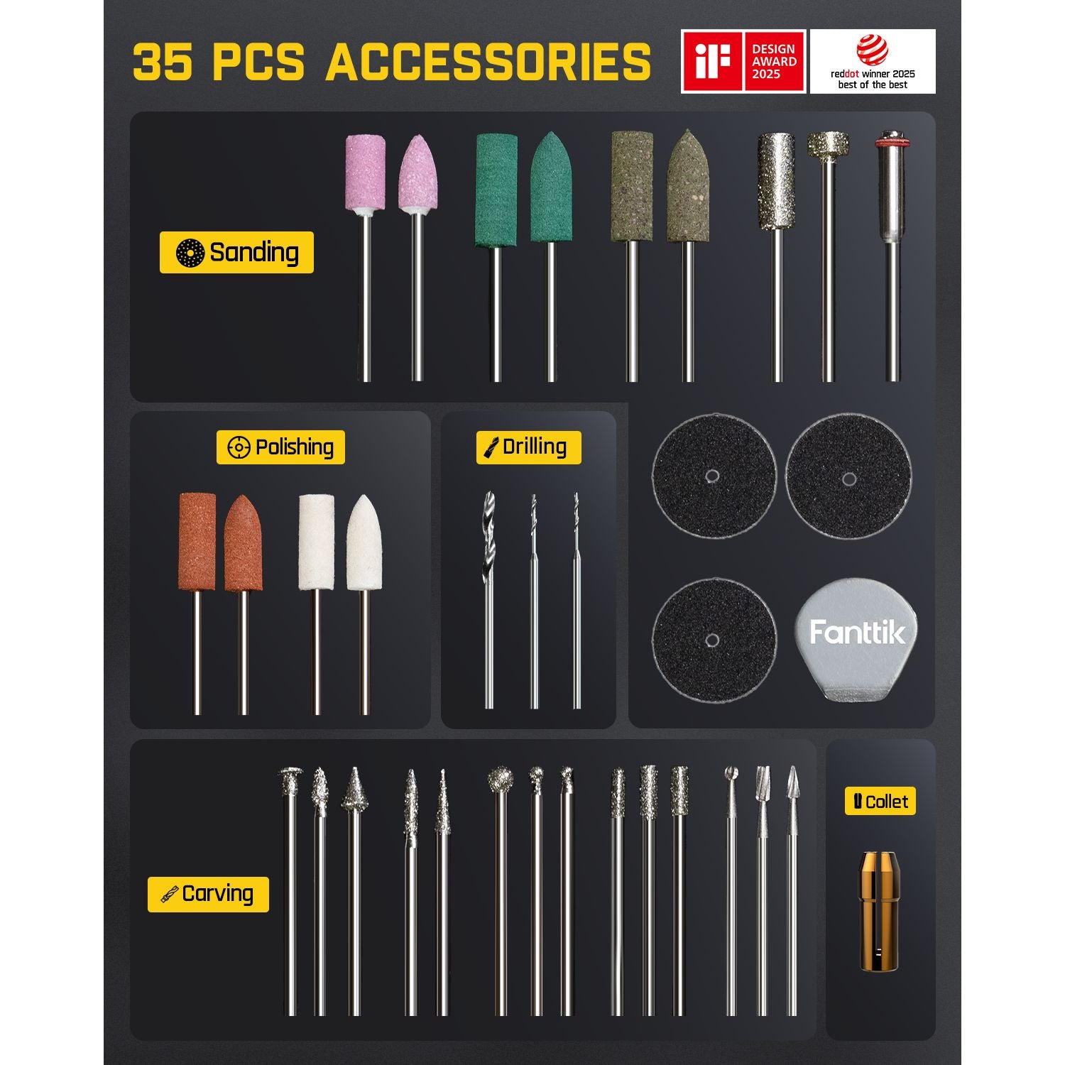 The F2 Master collet fits 3/32" / 2.3mm attachments.You can purchase replacement accessories based on this size. Your kit includes replacement collets, neatly stored in the mini slide-out drawer.